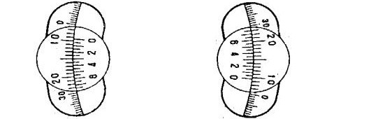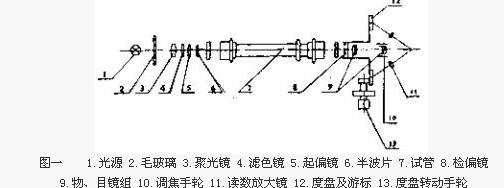 當(dāng)放進(jìn)存有被測(cè)溶液的試管后,由于溶液具有旋光性,使平面偏振光旋轉(zhuǎn)了一個(gè)角度,零度視場(chǎng)便發(fā)生了變化(如圖二a或c)。轉(zhuǎn)動(dòng)檢偏鏡一定角度,能再次出現(xiàn)亮度一致的視場(chǎng)。這個(gè)轉(zhuǎn)角就是溶液的旋光度,它的數(shù)值可通過放大鏡(10)從度盤(11)上讀出。