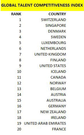 全球人才競爭力排名出爐 瑞士第一中國47