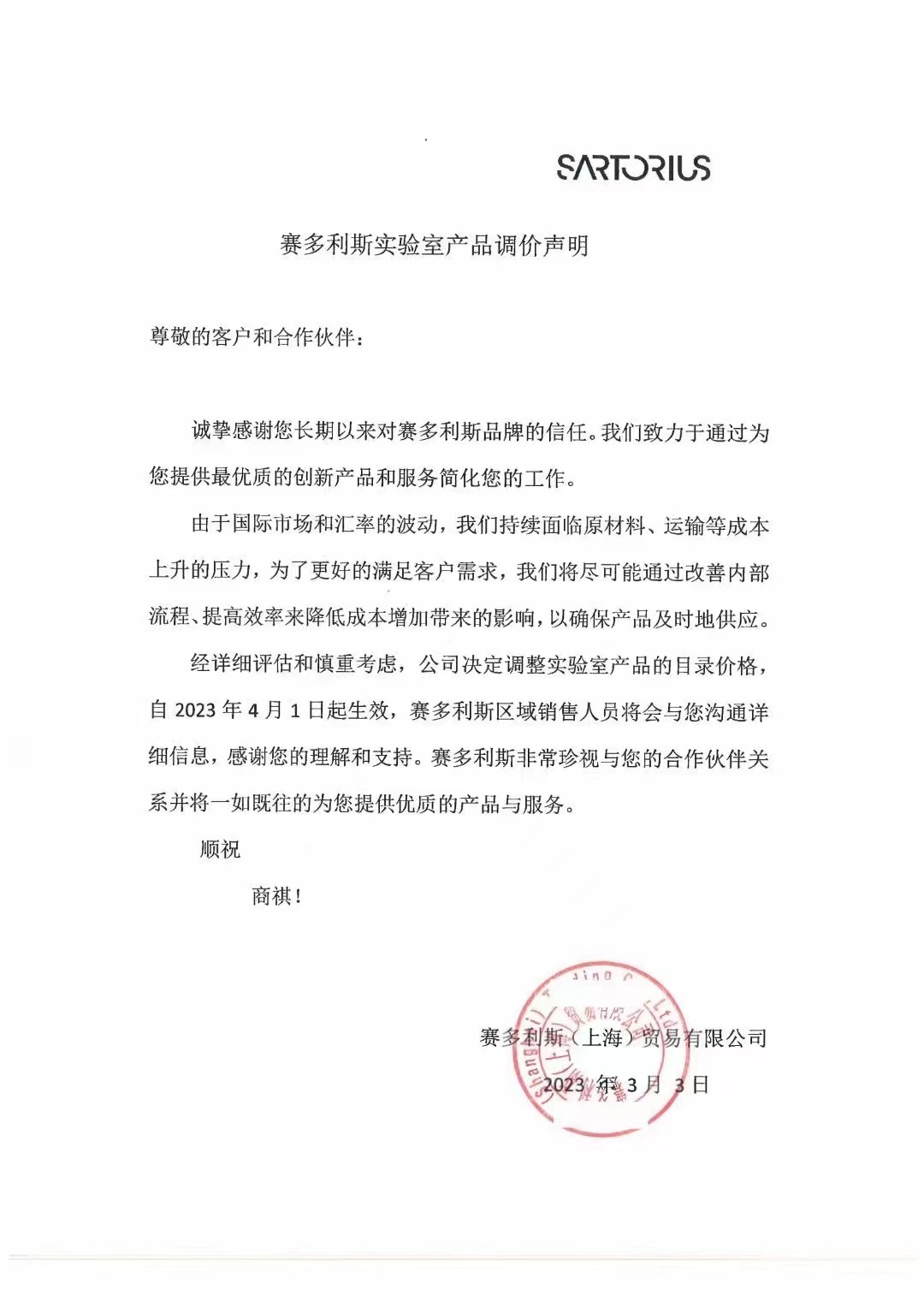 誠(chéng)摯感謝您長(zhǎng)期以來(lái)對(duì)賽多利斯品牌的信任。我們致力于通過(guò)為您提供最優(yōu)質(zhì)的創(chuàng)新產(chǎn)品和服務(wù)簡(jiǎn)化您的工作。由于國(guó)際市場(chǎng)和匯率的波動(dòng),我們持續(xù)面臨原材料、運(yùn)輸?shù)瘸杀旧仙膲毫Γ瑸榱烁玫臐M足客戶需求,我們將盡可能通過(guò)改善內(nèi)部流程、提高效率來(lái)降低成本增加帶來(lái)的影響,以確保產(chǎn)品及時(shí)地供應(yīng)經(jīng)詳細(xì)評(píng)估和慎重考慮,公司決定調(diào)整實(shí)驗(yàn)室產(chǎn)品的目錄價(jià)格自2023年4月1日起生效,賽多利斯區(qū)域銷售人員將會(huì)與您溝通詳細(xì)信息,感謝您的理解和支持。賽多利斯非常珍視與您的合作伙伴關(guān)系并將一如既往的為您提供優(yōu)質(zhì)的產(chǎn)品與服務(wù)。順祝商祺!